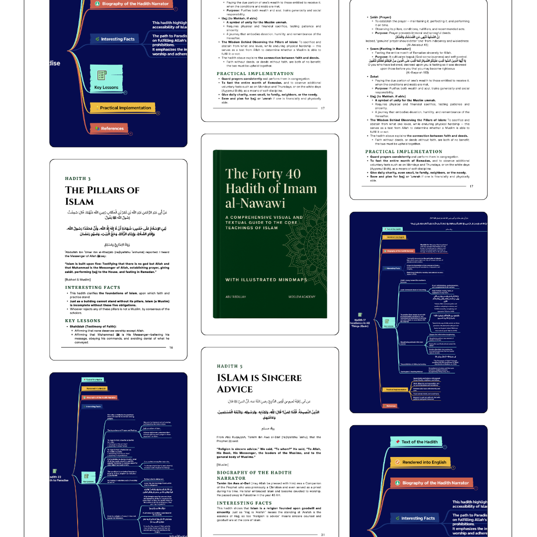 Experience our first grand launch — a comprehensive visual and textual guide to Imam al-Nawawī’s Forty Hadiths, summarizing the core teachings of Islam from classical commentaries such as those by Ibn Daqīq al-ʿĪd, Ibn Ḥajar, and Ibn Rajab. This special edition includes a 184-page eBook with clear English commentary and 43 beautifully illustrated mindmaps — one for each hadith plus a muqaddimah — designed to help Muslims learn, visualize, and reflect on the Prophet’s timeless guidance in a structured and practical way.