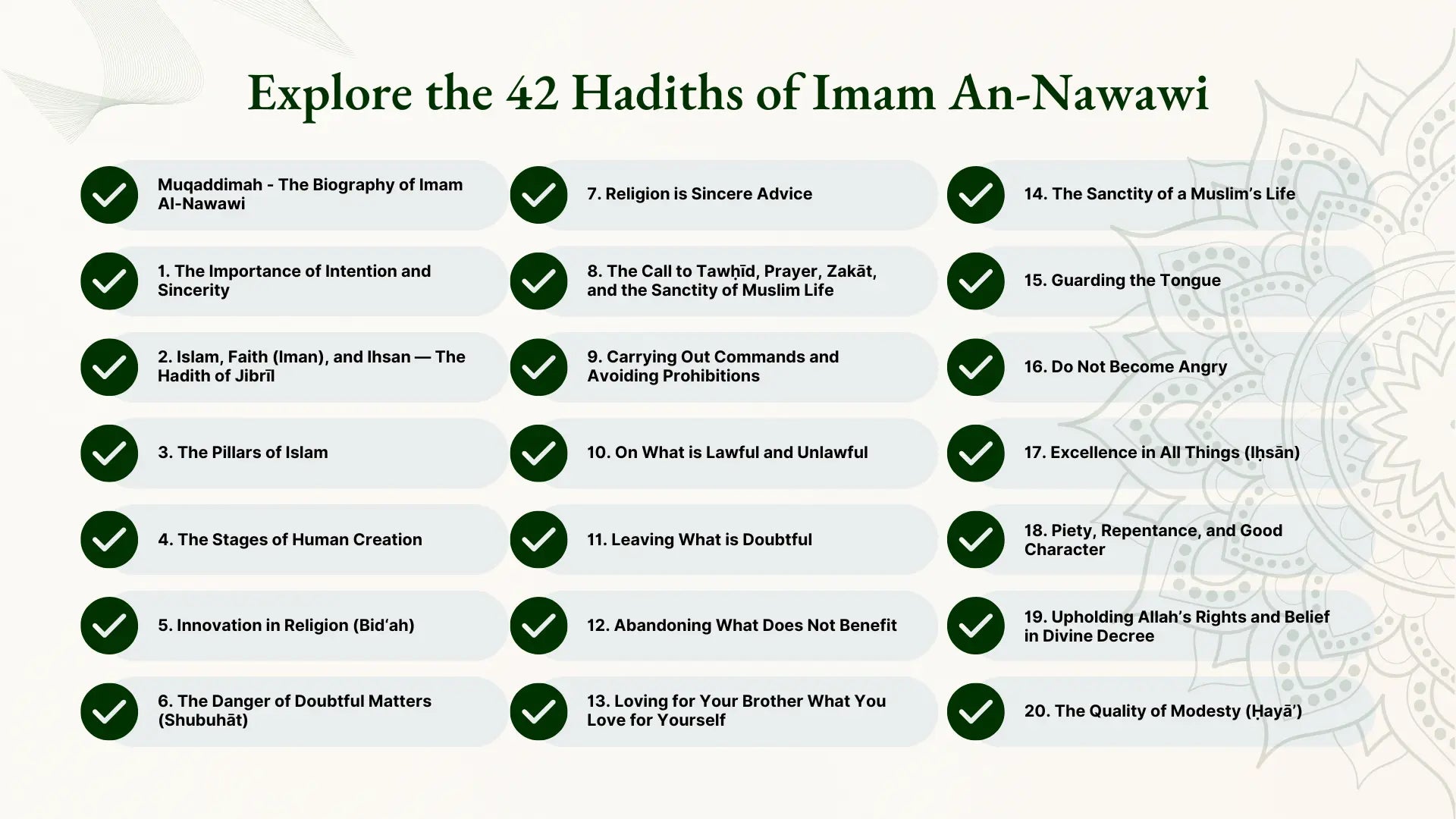 One for each hadith + the biography of al-nawawi, designed for clarity and retention.