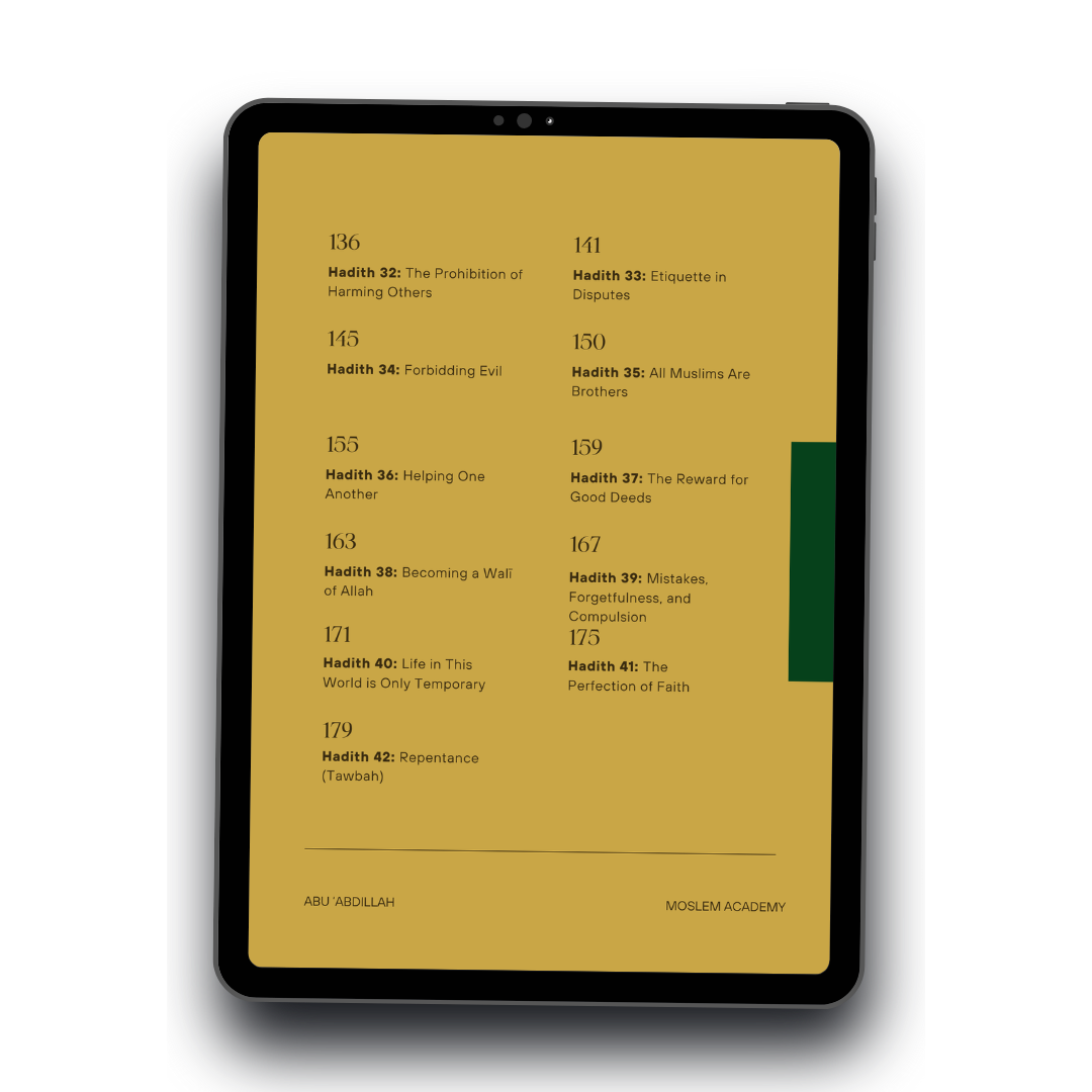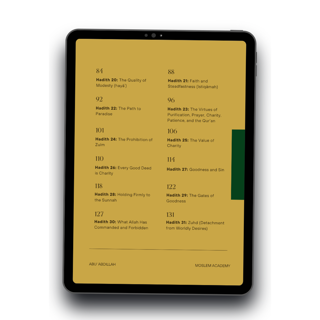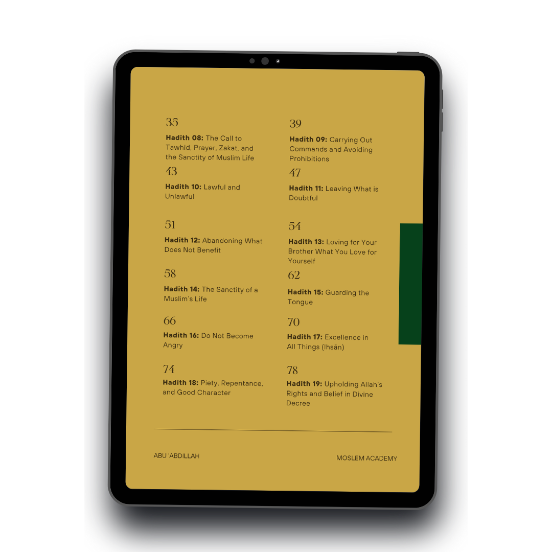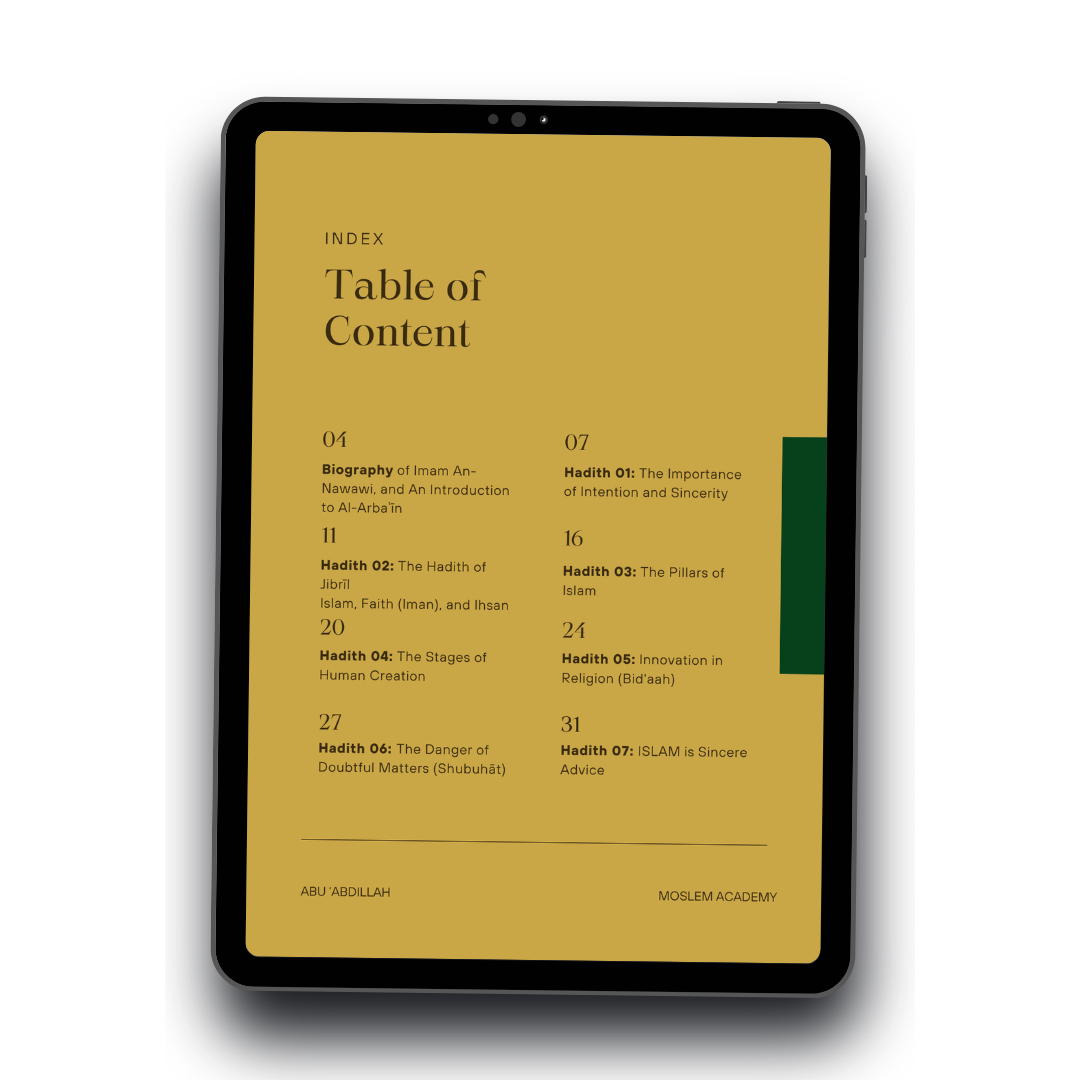 A comprehensive visual and textual guide to Imam al-Nawawī’s Forty Hadiths, summarizing the core teachings of Islam from classical commentaries such as those by Ibn Daqīq al-ʿĪd, Ibn Ḥajar, and Ibn Rajab. This special edition includes a 184-page eBook with clear English commentary and 43 beautifully illustrated mindmaps — one for each hadith plus a muqaddimah — designed to help Muslims learn, visualize, and reflect on the Prophet’s timeless guidance in a structured and practical way.